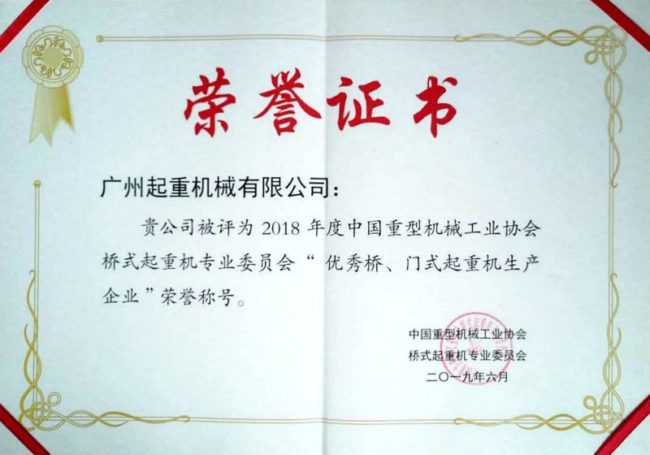 2019年6月3日,会议对协会的14家2018年度“优秀桥、门式起重机生产企业” ,19家2018年度“优秀起重机配套件供应商” , 10位2017~2018年度“先进协会工作者” 进行了表彰。我司荣获2018年度“优秀桥、门式起重机生产企业”称号。